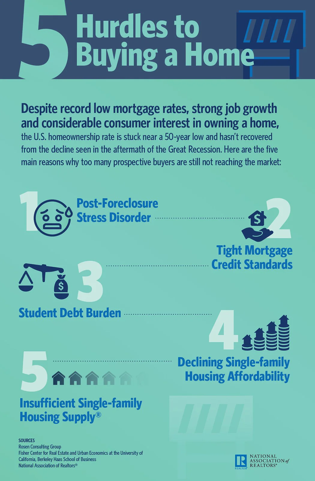 In recognition of National Homeownership Month, NAR has released a new white paper entitled, "Hurdles to Homeownership: Understanding the Barriers," identifying five key hurdles keeping the U.S. homeownership rates stuck at 50-year-low despite low mortgage rates and recovering job markets.